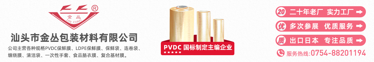 汕頭市金叢包裝材料有限公司位于廣東汕頭市金平區,主營PVDC保鮮膜、LDPE保鮮膜、PVDC腸衣膜、HDPE連卷保鮮膜、HDPE背心型保鮮袋、HDPE一次性手套,混合PE無芯垃圾袋等。